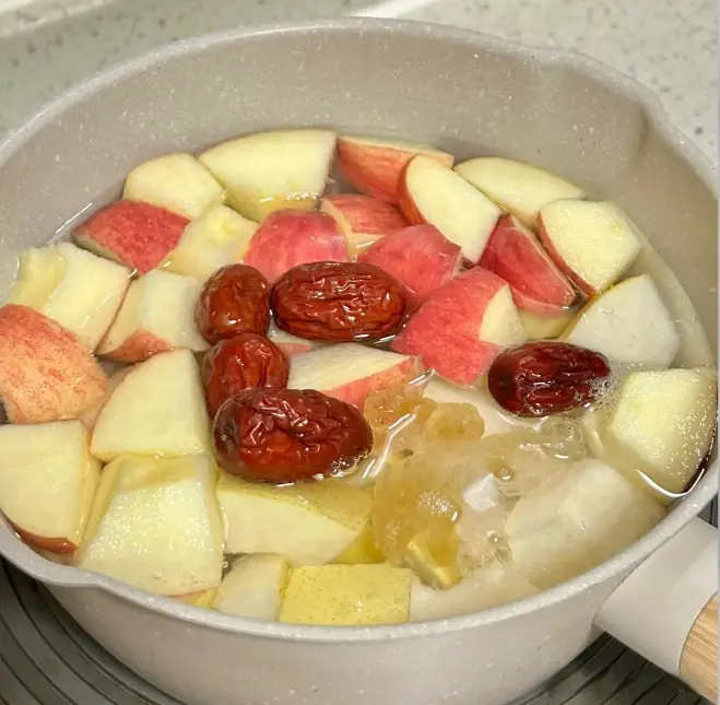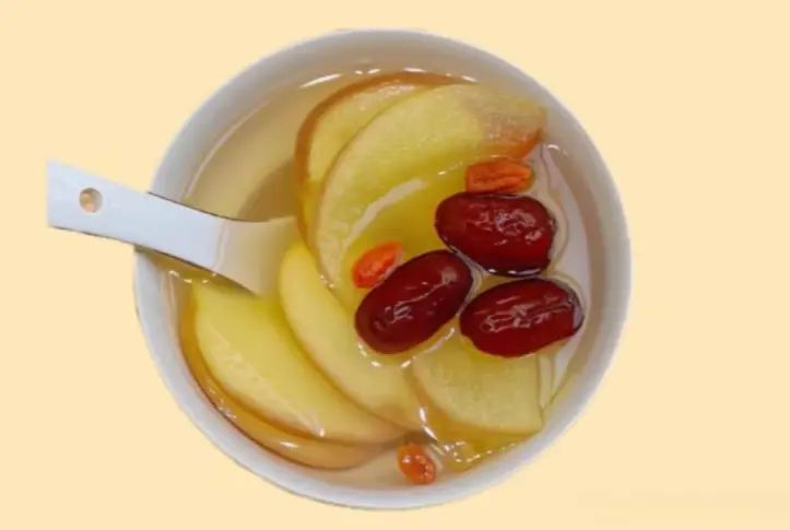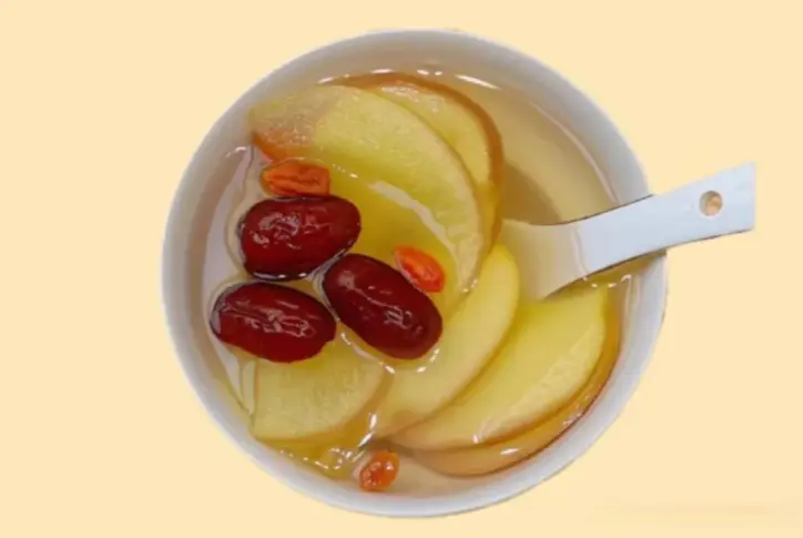 苹果洗净后去皮切块,红枣去核,枸杞洗净备用。锅里加入适量清水,放入红枣和苹果块,大火烧开后转小火煮20分钟。加入枸杞和冰糖,继续煮5分钟,直到冰糖完全融化,汤色微微泛红。关火,盛出即可享用。品鉴经验: